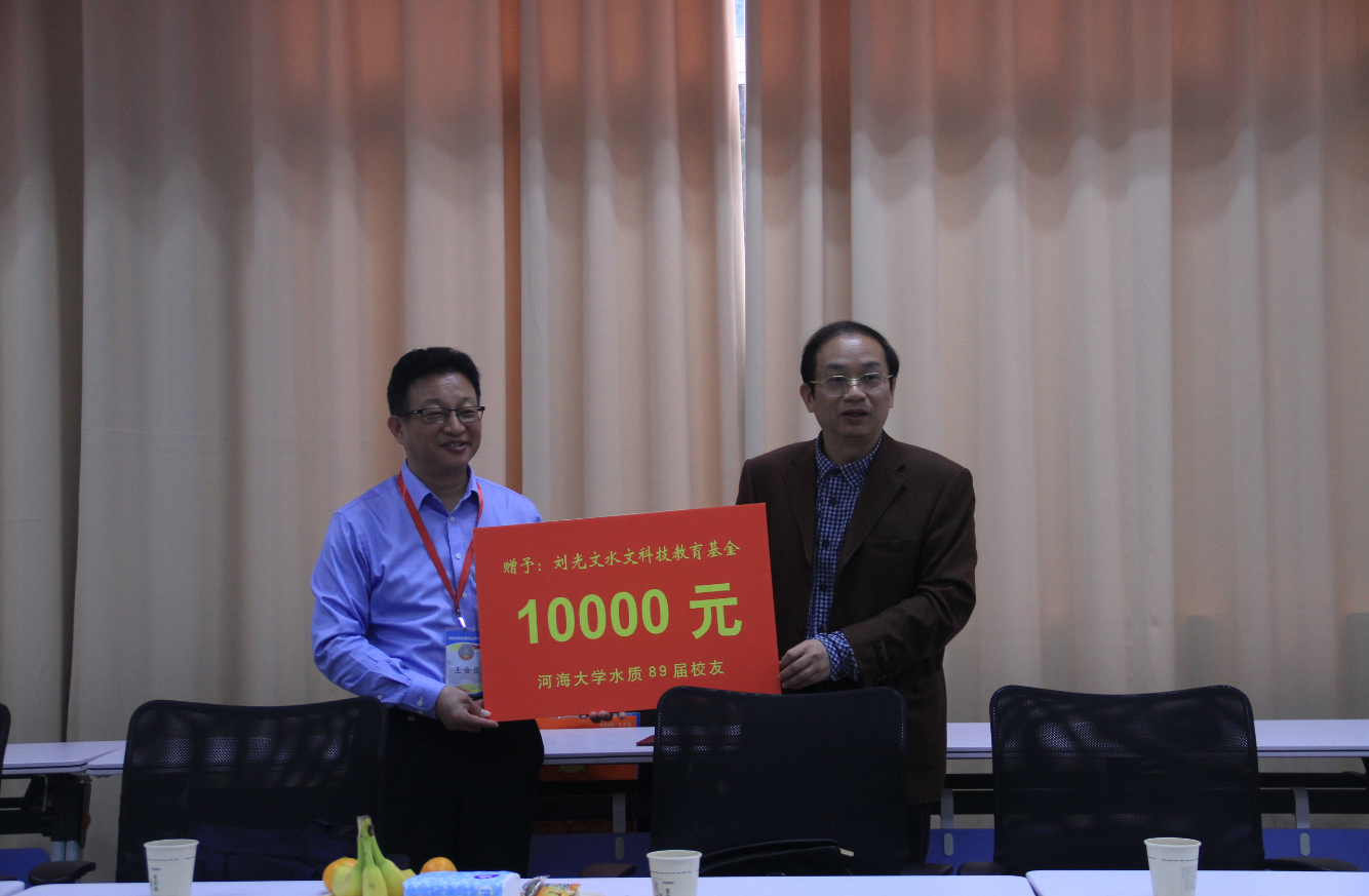 校友们汇报了各自的工作生活情况,感谢老师们的谆谆教诲,纷纷表示将继续努力,关心支持母校的发展。最后水质89届一个班的校友向刘光文水文科技教育基金捐赠1万元的经费,用于水文事业的建设和发展。