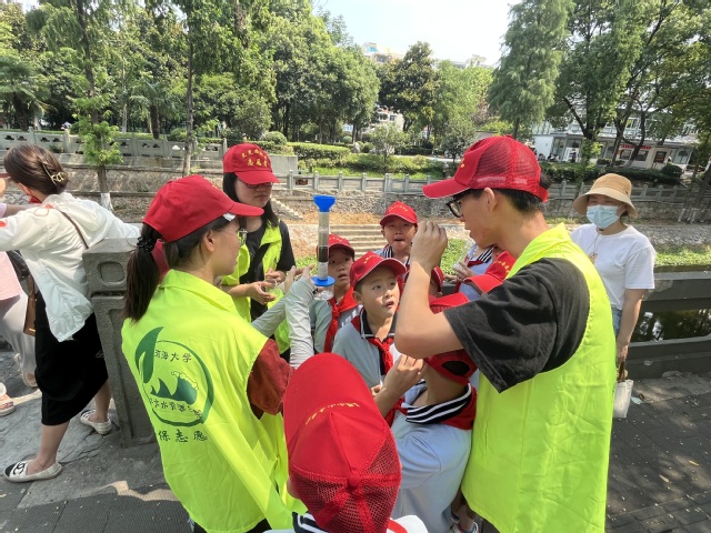 夏日炎炎,也挡不住小朋友们参与亲手检测身边河道水质的热情。在志愿者们的指导下,一行人来到了明御河进行了河水采样志愿者们向小朋友分发了试纸,让小朋友们感受检测河水酸碱度的过程。通过简易滤水装置,让小朋友们体会滤水实验。小朋友们认真听、仔细看、用心思考,提出了许多关于水的问题,从健康饮水、到观察排污口,志愿者们详细讲解,也在小朋友心中种下了爱水、护水的种子。