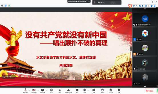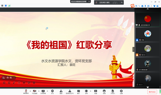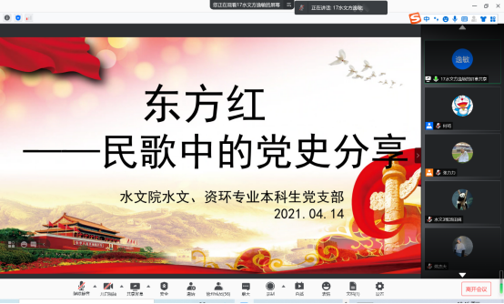 2021年4月14日晚七点半,太阳集团9728水文、资环专业本科生党支部“民歌中的党史” 音诗画分享会主题党日活动如期开展,支部书记张力力同志主持了本次分享会,支部全体党员同志参与本次主题党日活动。