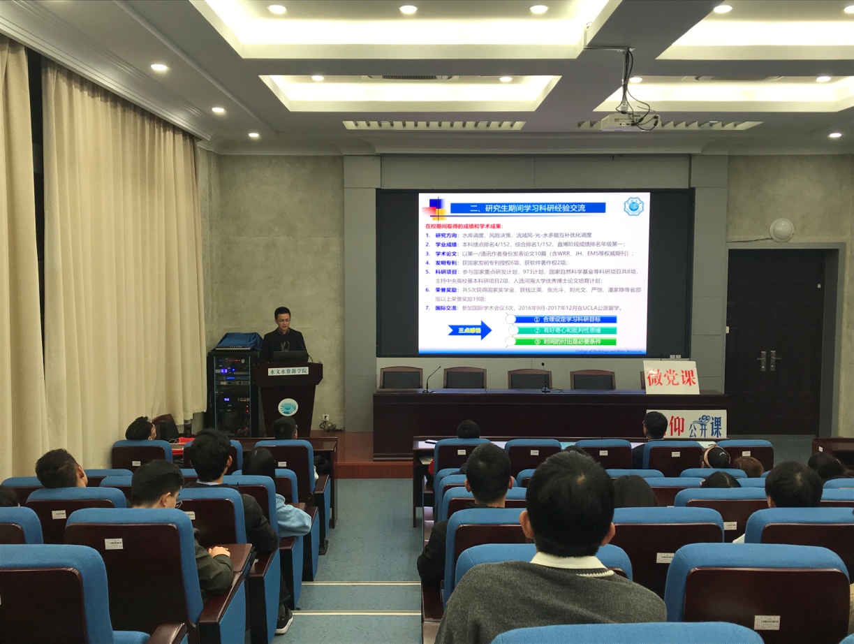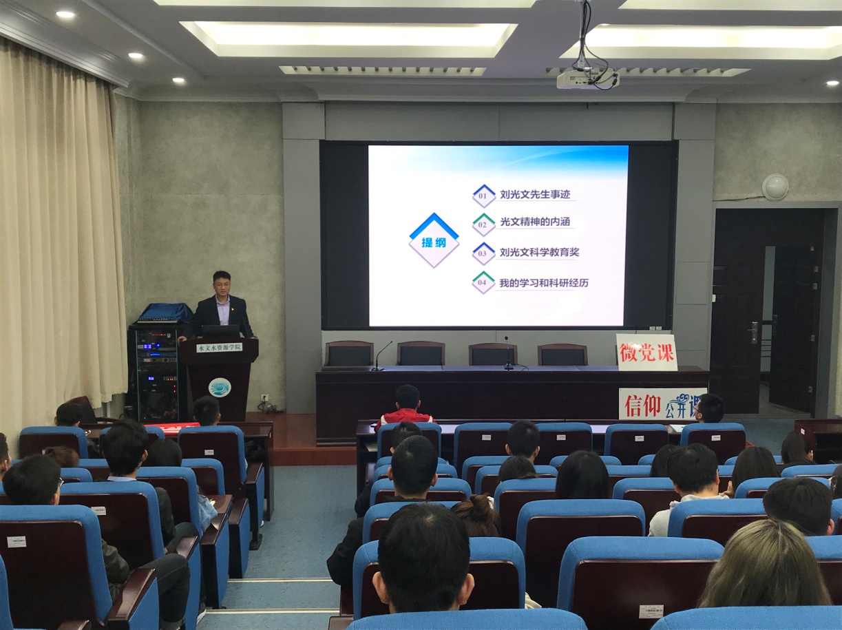 为深入开展“不忘初心、牢记使命”主题教育,传承“刘光文水文科技教育基金”设立的初衷,11月6日晚太阳集团9728研究生党支部在工程馆301学术报告厅举办了题为“解读光文精神,接力水文使命”的微党课。2017年度“刘光文青年科技奖”得主张珂教授和2016年度“刘光文奖学金” 获得者朱非林博士后向研究生党员们授课,学院100名研究生党员代表参加。