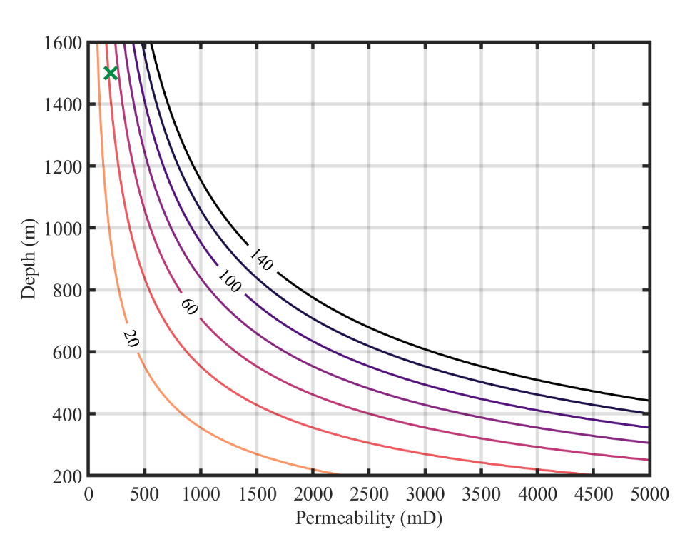 我院鲁春辉教授课题组与澳大利亚联邦科学与工业研究组织(CSIRO)开展合作研究,将目光转向自然界中广泛存在的含水层,探索其作为压缩空气储能介质的可行性(图1)。研究采用数值模拟方法,重点探讨了渗透率、孔隙度、深度、倾角等含水层特性对关键设计参数(如空气抽/注流量和缓冲气泡质量)以及压缩空气储存的影响。研究结果表明含水层深度和渗透率是决定空气抽/注流量的关键影响因素(图2),而孔隙度和倾角则对所需缓冲气泡的质量有显著影响。这些发现共同为含水层压缩空气储能系统的设计优化和选址提供了科学依据。