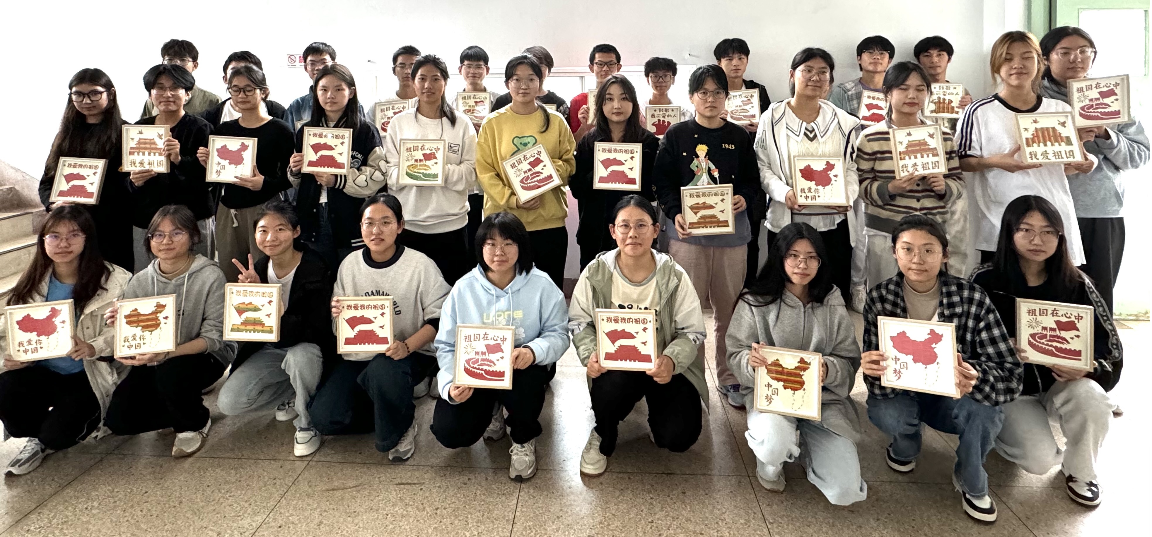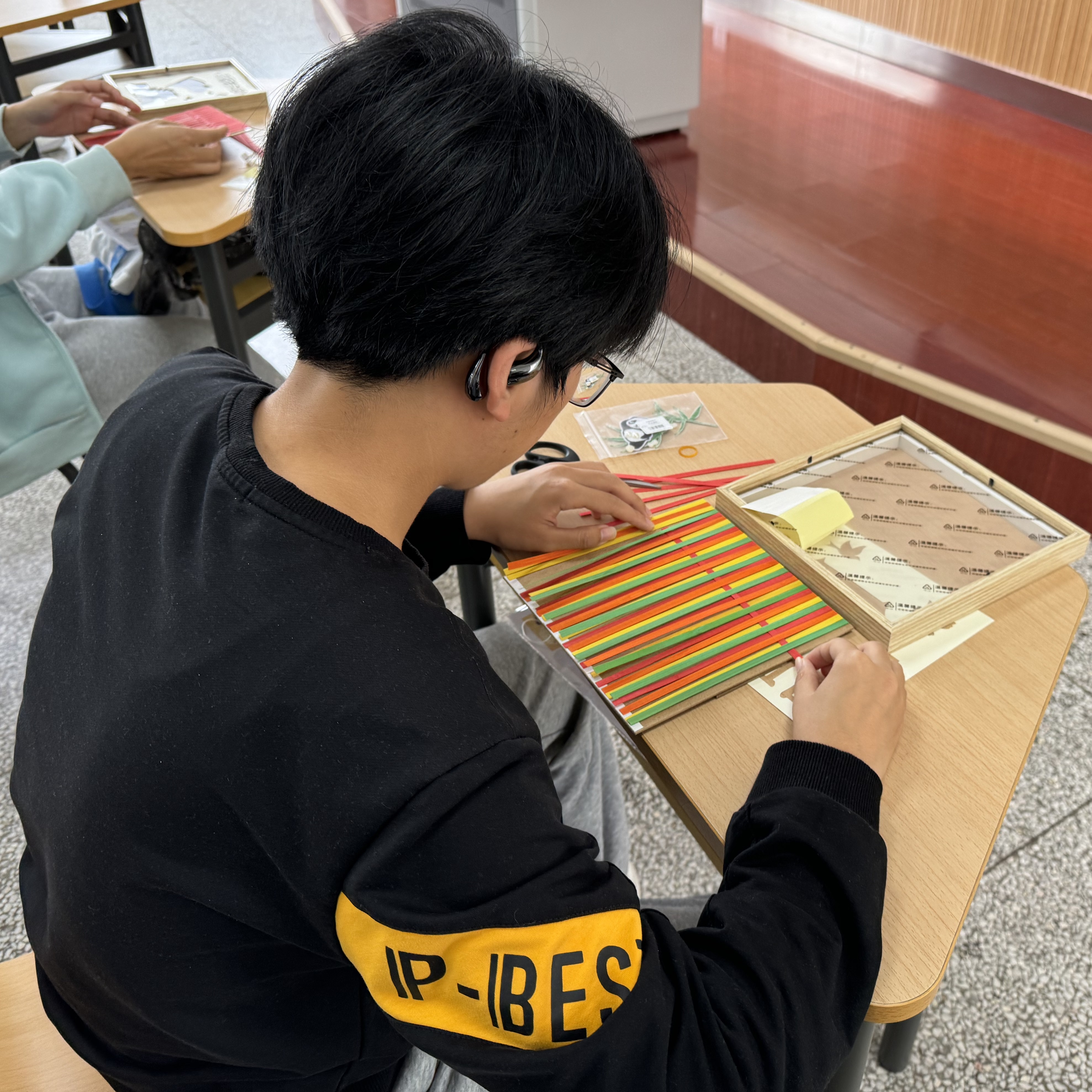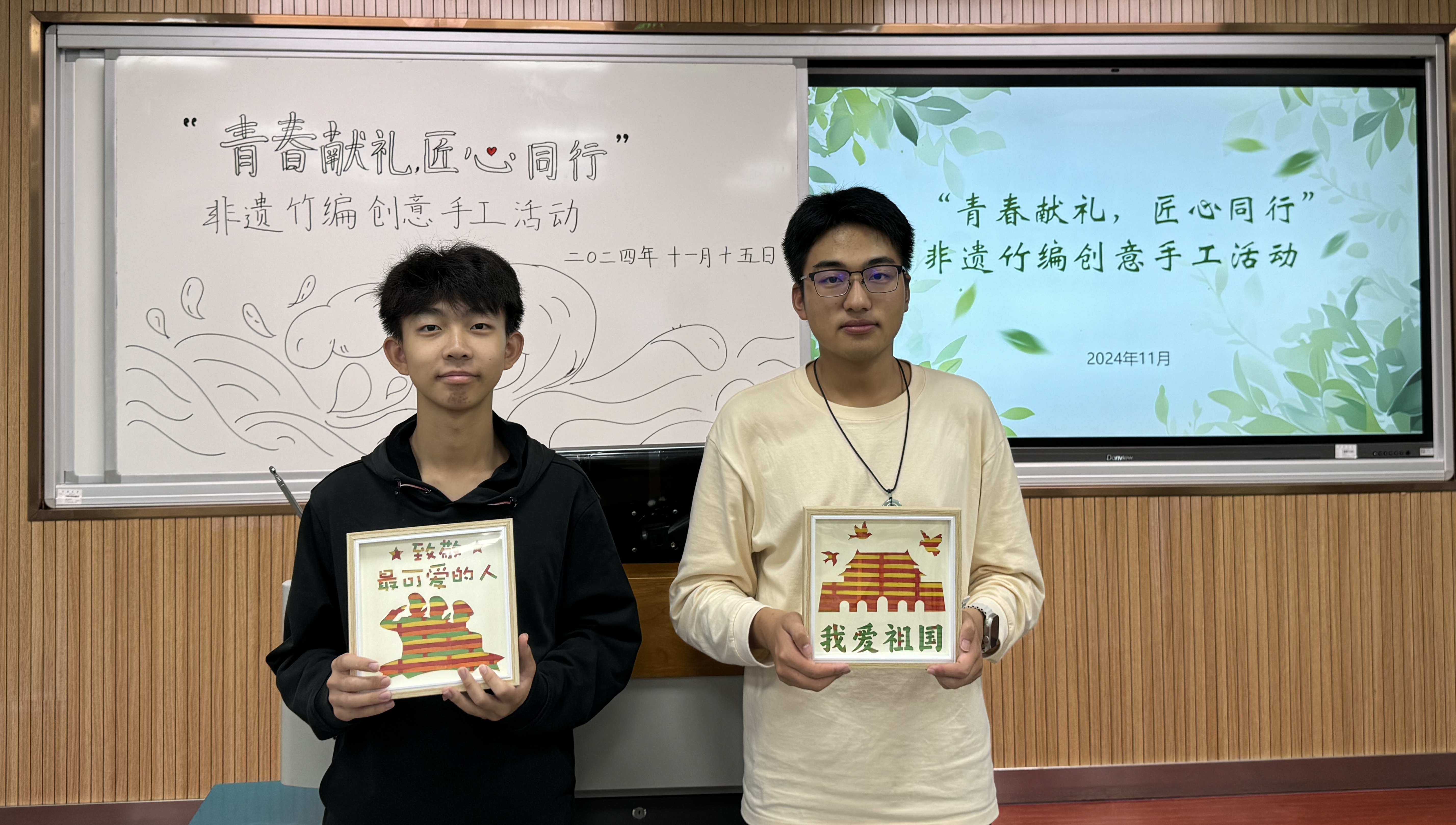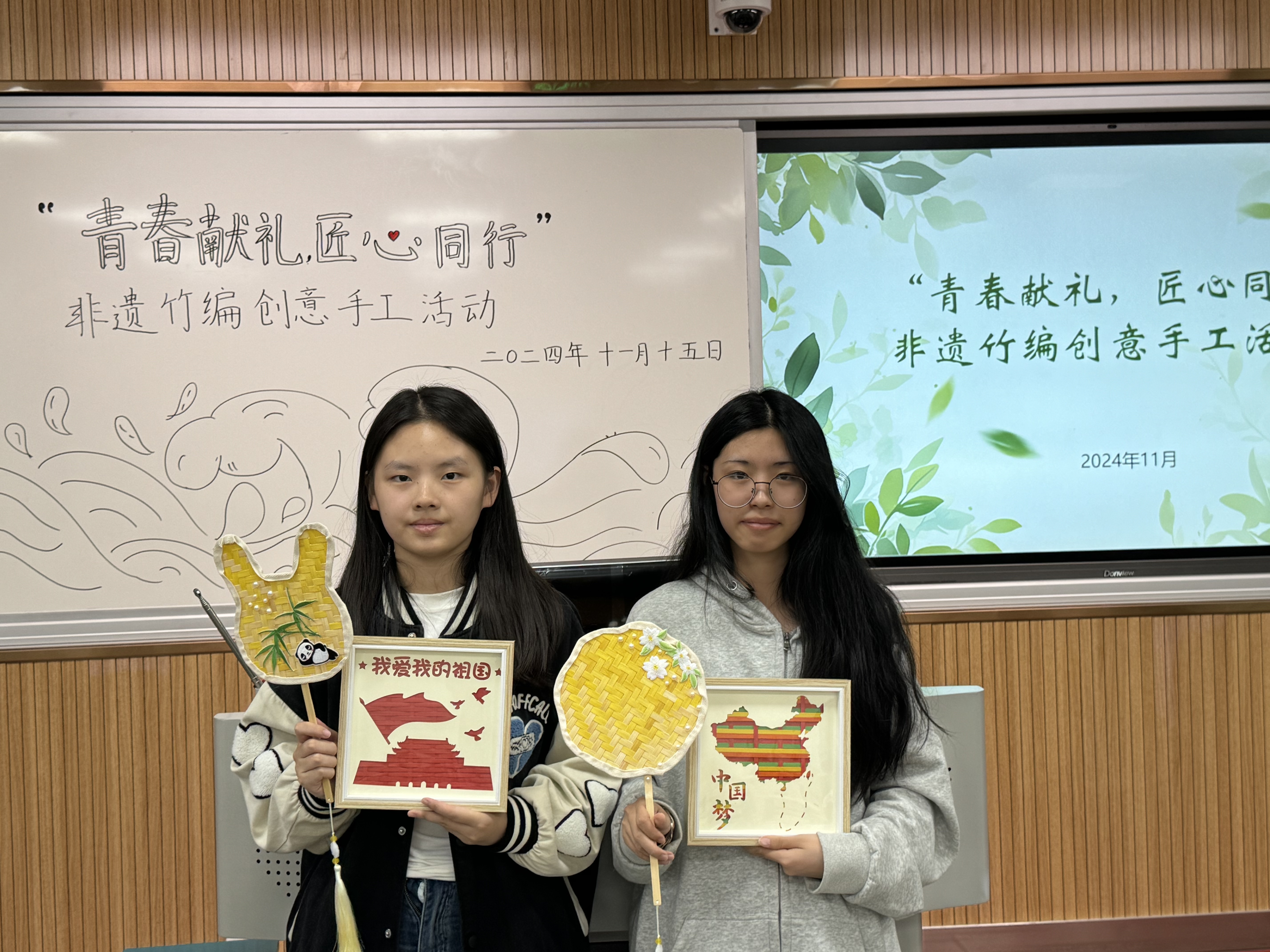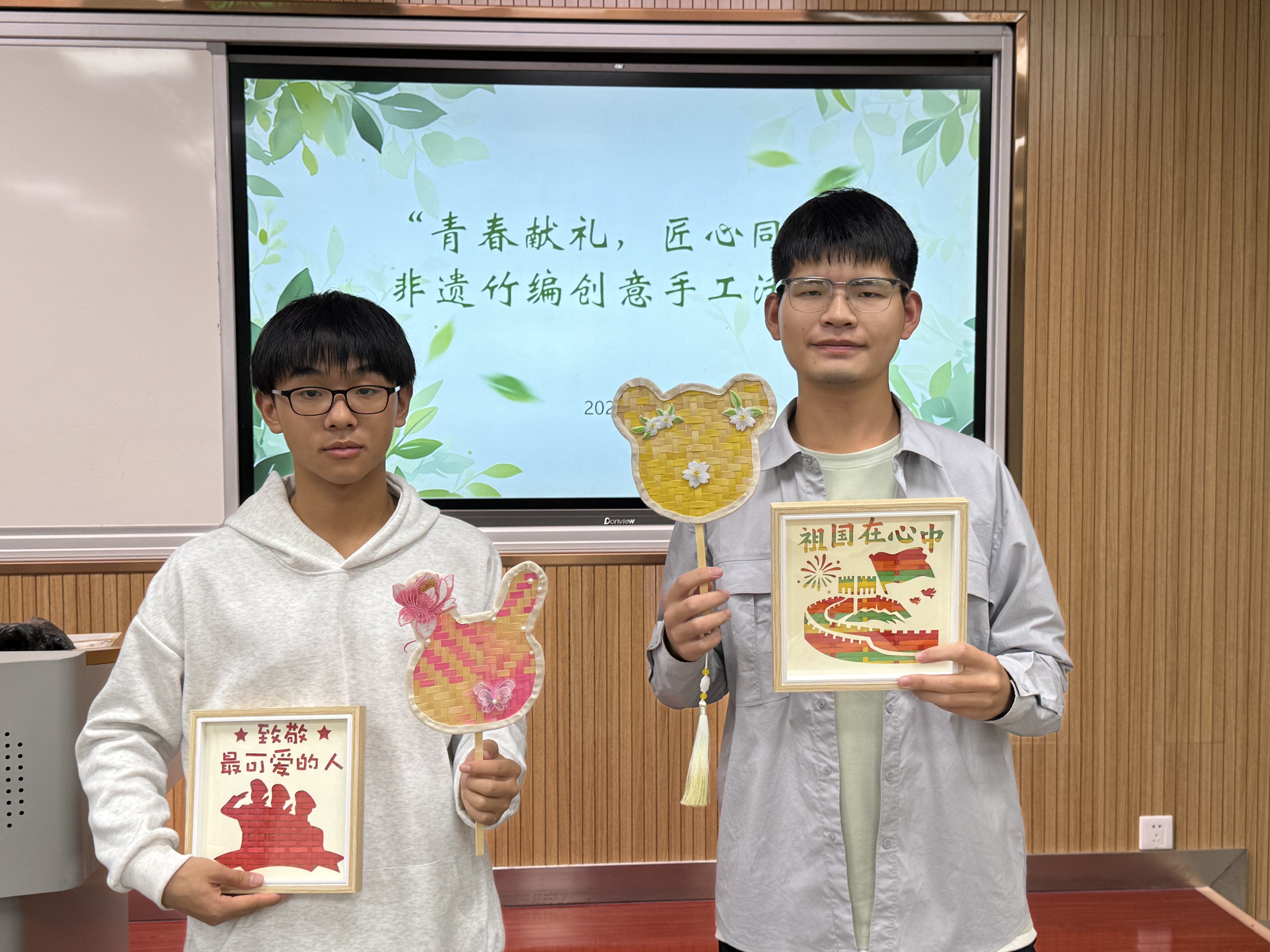 辅导员吴晓芬老师简要介绍了竹编的发展历史、制作流程及传承意义,说明了竹编过程中的注意事项,并呼吁同学们以制作竹编作品为契机表达对祖国繁荣富强的美好祝福。制作的过程中,同学们在老师的指导下以手造物,以物寄情,通过一上一下,一横一竖的编织方法,在挑、压、破、拼、提等手工编织技法下,将心中图景编织成了一幅幅饱含爱国爱党情怀的竹编画作品和一个个充满深厚文化底蕴的竹编扇作品。