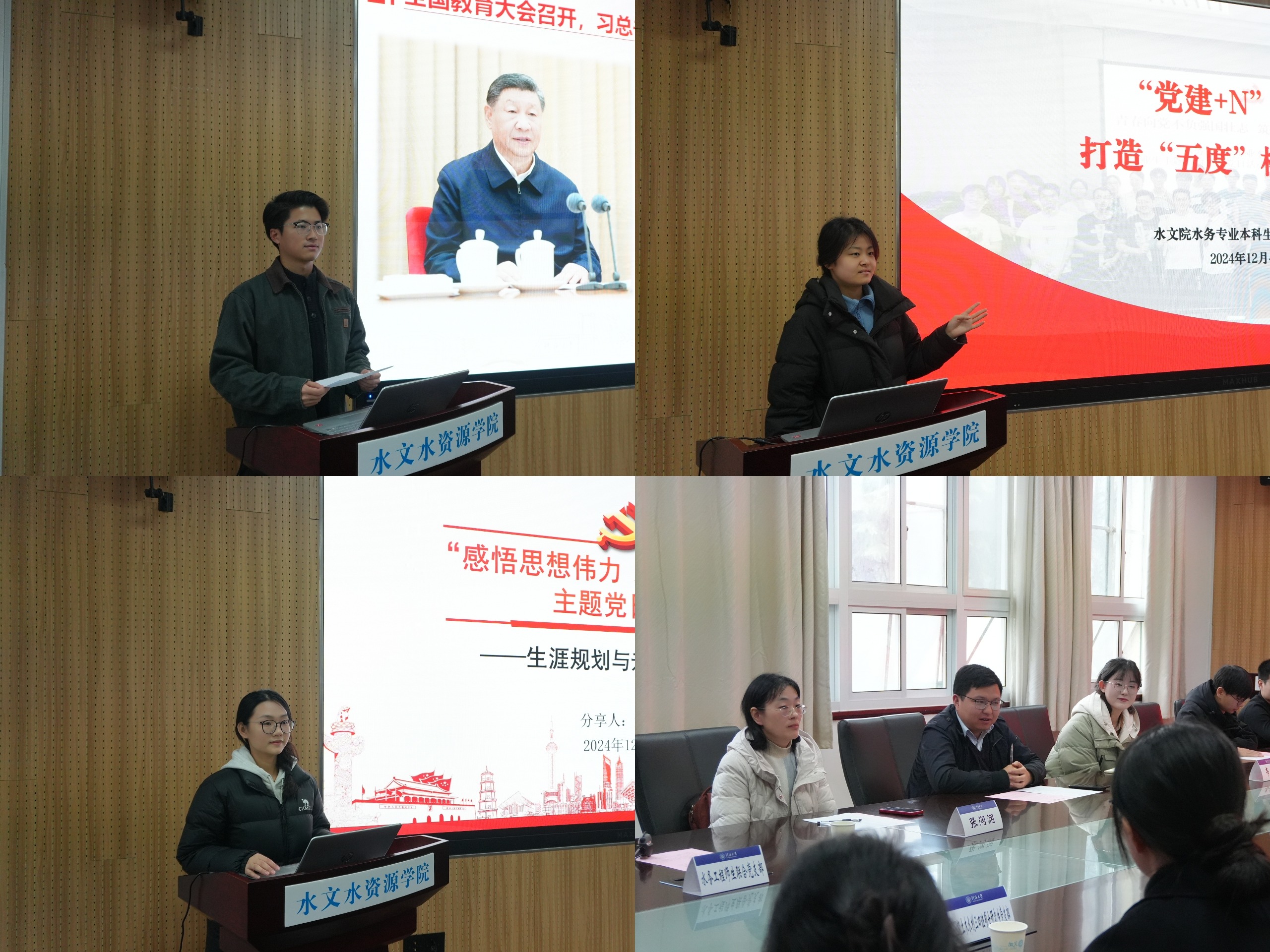 2024级土木水利一二班硕士研究生党支部书记王亚辉以“立报国强国大志向,做挺膺担当奋斗者—教育强国建设中的青年担当”为题,带领与会党员们共同学习了习近平总书记在全国教育大会上的重要讲话精神。水务专业本科生党支部宣传委员王杰分享了在创建“强基创优”样板党支部方面的经验做法和特色举措。座谈交流阶段,各支部学生党员们就支部建设、组织生活开展以及自身日常学习生活、职业生涯规划中存在的疑问和思考互相交流。2022级土木水利三四班硕士研究生党支部书记索玉娇做了题为“生涯规划与升学就业选择”的经验分享,高成教授和水务工程师生联合党支部纪律委员张润润老师分别结合自身的工作经验为学生党员们答疑解惑,提出了宝贵的建议。