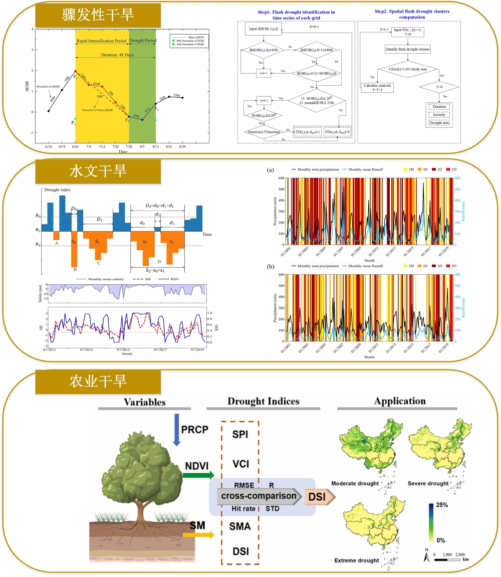 针对已有的骤发性干旱识别方法仅关注时间维度特征,忽略其时空关联性的问题,提出了融合游程理论和迁移追踪法的骤发性干早三维识别方法,综合考虑了骤发性干早的迅速发展期和干旱持续期,使得骤发性干旱的识别过程更加完善;针对滨海流域干旱过程具有滞后性与累积性的问题,构建了集成降水量、蒸发量、径流量、地表温度(LST)、植被指数(NDVI)及盐度等关键因子的沿海干旱指数,首次系统探讨了盐度在干旱形成与演变过程中的响应机制,填补了相关领域的研究空白;针对如何在干湿气候条件下实现可靠准确的区域农业干旱评估的问题,系统构建并比较了多种干旱指数,包括标准化降水指数(SPI)、植被条件指数(VCI)、土壤水分异常指数(SMA)和干旱严重程度指数(DSI),其中通过与中国官方原位干旱信息对比验证,DSI指数表现出较高的敏感性与准确性,具备跨气候区农业干旱识别与监测的应用潜力。