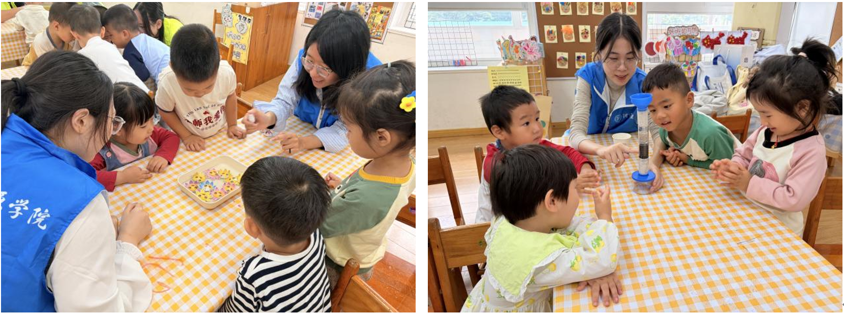 活动以趣味绘本《小水滴的旅行》拉开序幕。志愿者手持绘本,生动讲述水的循环故事,从云朵中的小水滴到生活里的饮用水,帮助孩子们轻松理解水的特性与用途。随后的“感官体验”环节,孩子们围在志愿者身旁,用小勺子舀水、往水中放入花瓣与石子,通过亲手操作,直观感受水的透明、无味,以及能承载物体的物理特点。