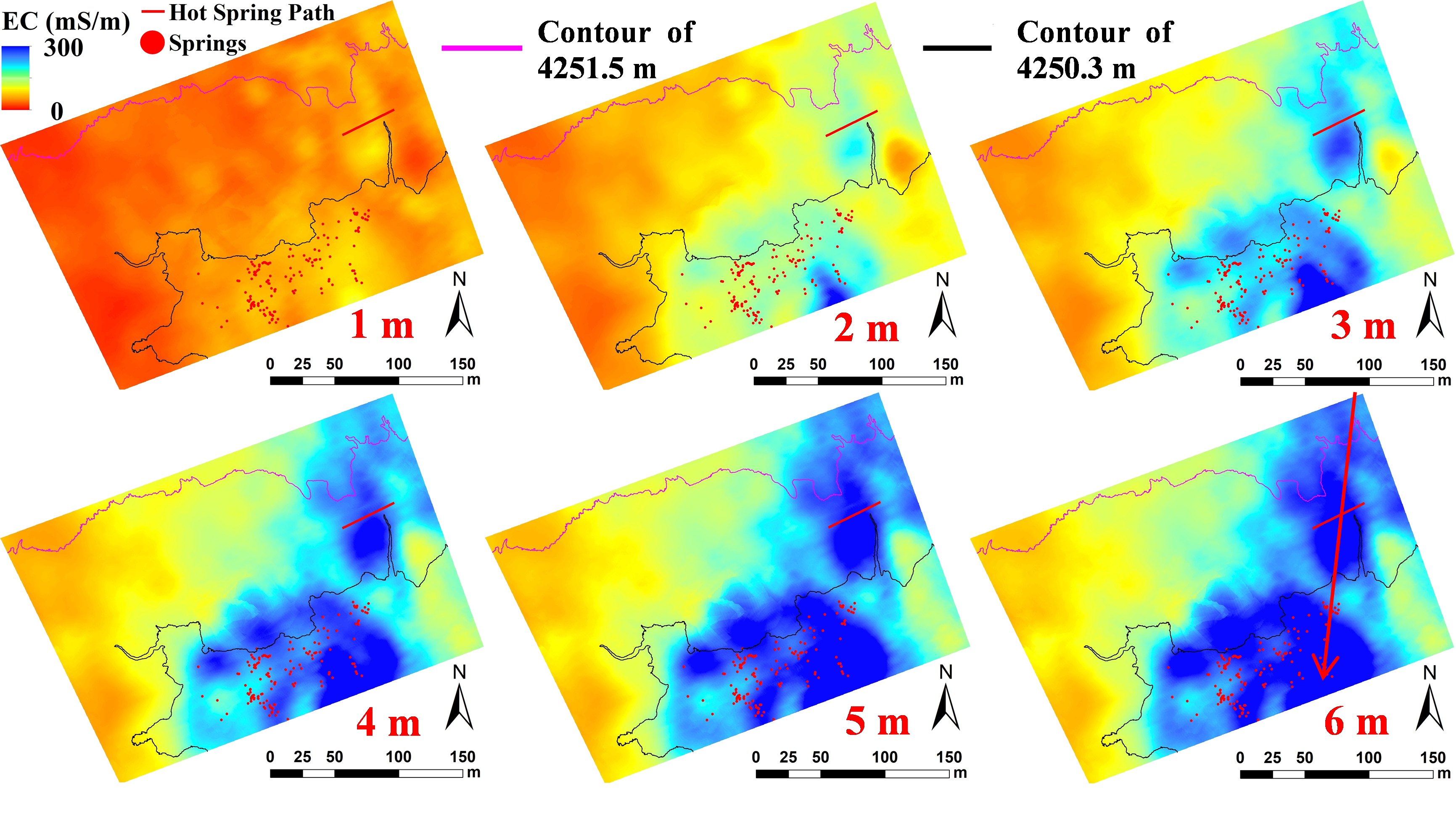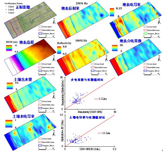 研究成果在南京长江河岸带、西藏羊八井热泉区和黄海盐碱化农田进行实地测试,结果显示:UAV-FDEM成功描绘了地热水的入侵范围及其潜在地下流动通道,测得的高电导率异常区对应于地热水入侵区,与实地热泉分布特征相符,进一步对比分析显示,UAV-FDEM的探测结果与高密度电法(ERT)结果具有良好一致性;UAV-GPR能够准确反映研究区内土壤水分与盐分的空间分布特征,其测得的介电常数与电导率结果与HydraProbe等接触式探针的实测数据高度一致。
