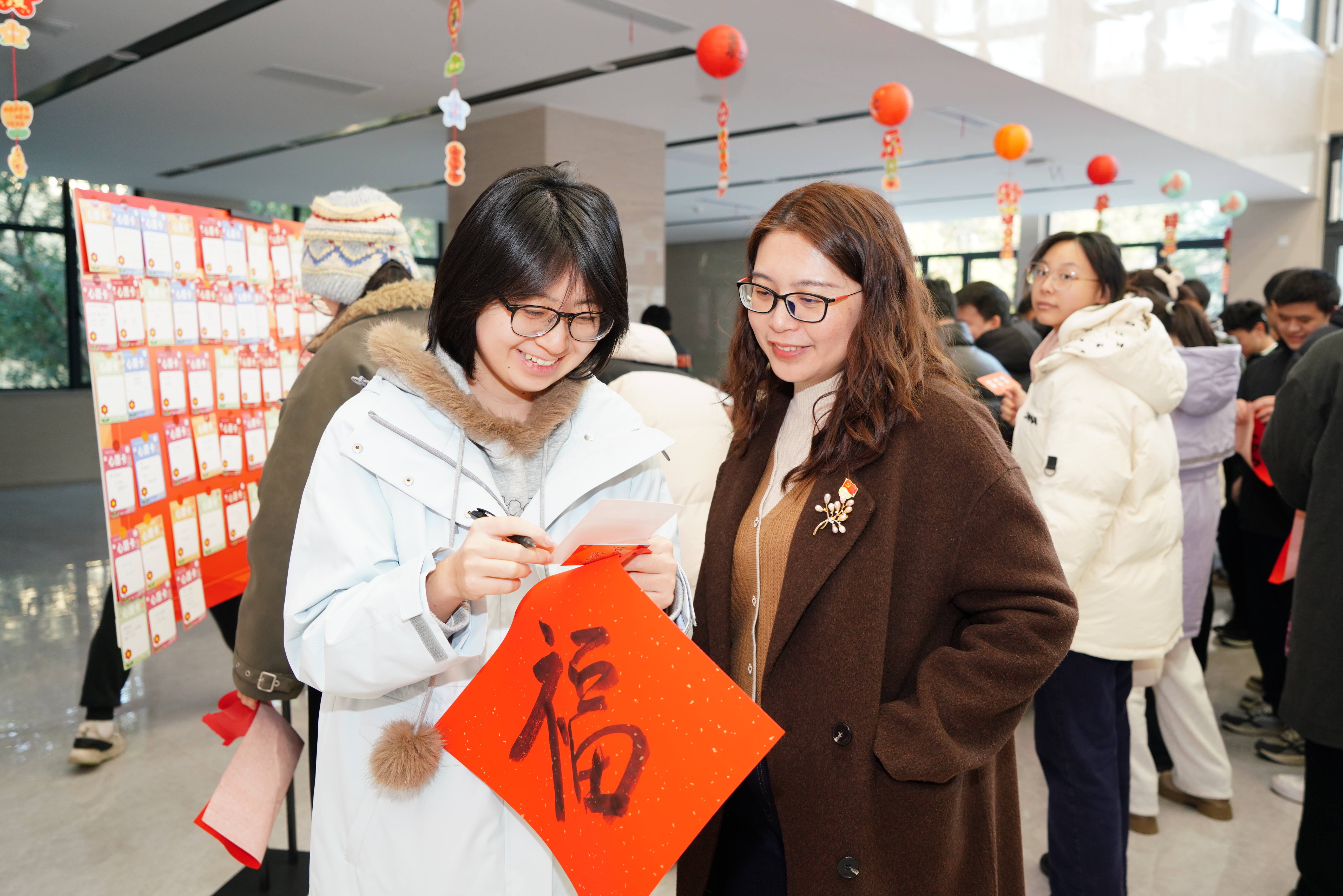 本次活动以新年游园为载体,设置“对答如流”、“红色记忆”、“翰墨迎春”、“投壶纳福”、“巧剪生花”、“新声寄语”六个环节。师生通过知识问答、经典红色场景辨认等形式,强化理论武装,筑牢信仰根基。“翰墨迎春”环节,师生执笔书写春联与“福”字,传递新春祝福;“投壶纳福”与“巧剪生花”则让大家在传统游戏与剪纸艺术中亲身体验中华文化的魅力。现场气氛热烈、年味浓郁,心愿墙上贴满了师生们对过去一年的总结与新年的展望,传递出真挚的期盼与奋进的决心。